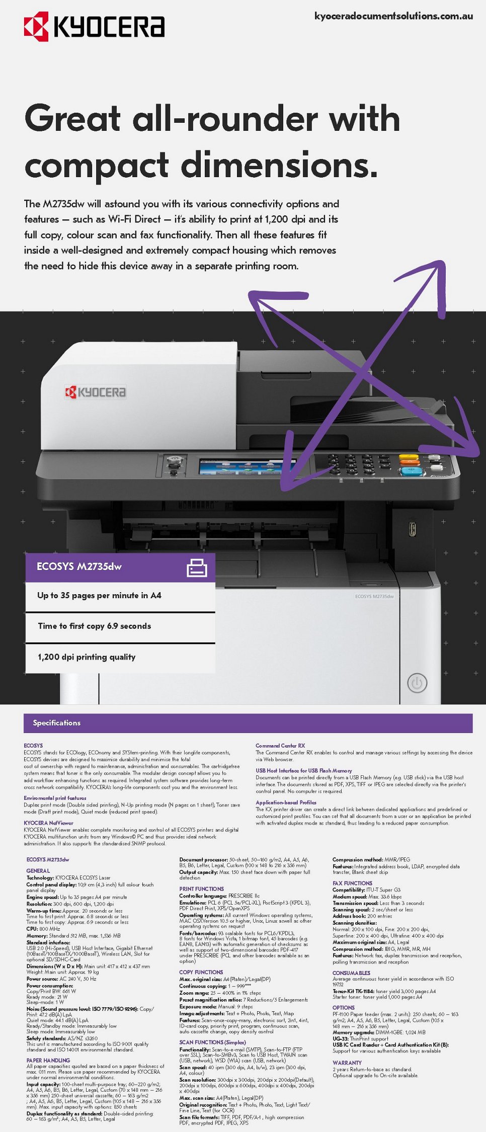Double-sided print. Single-sided copy, scan and fax. Copy double-sided ID cards on a single sheet of paper with ease. Exceptionally low printing costs in its class. Offers Wi-Fi, Wi-Fi Direct, AirPrint, Mopria and KYOCERA Mobile Print. 4.3 inch (10.9 cm) touch screen for improved usability