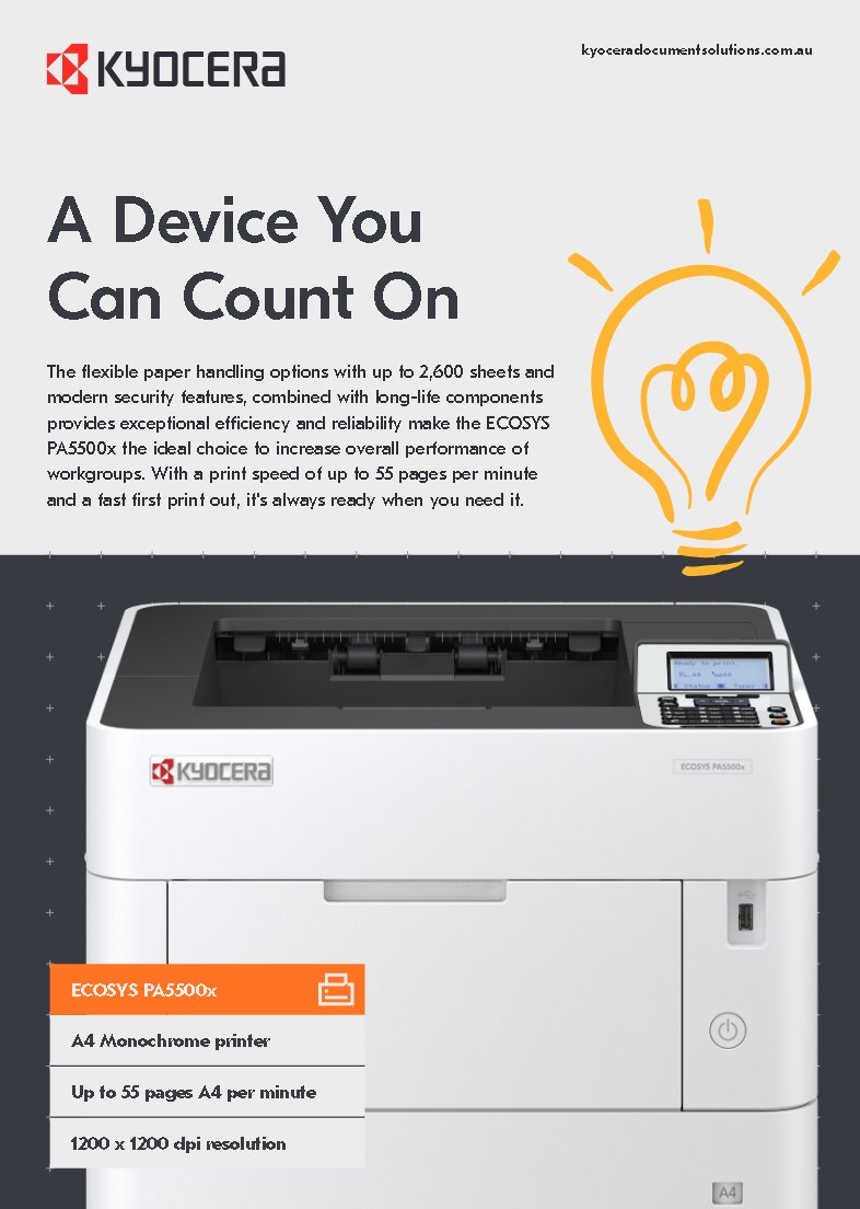 The flexible paper handling options with up to 2,600 sheets and modern security features, combined with long-life components provides exceptional efficiency and reliability make the ECOSYS PA5500x the ideal choice to increase overall performance of workgroups. With a print speed of up to 55 pages per minute and a fast first print out, it's always ready when you need it.