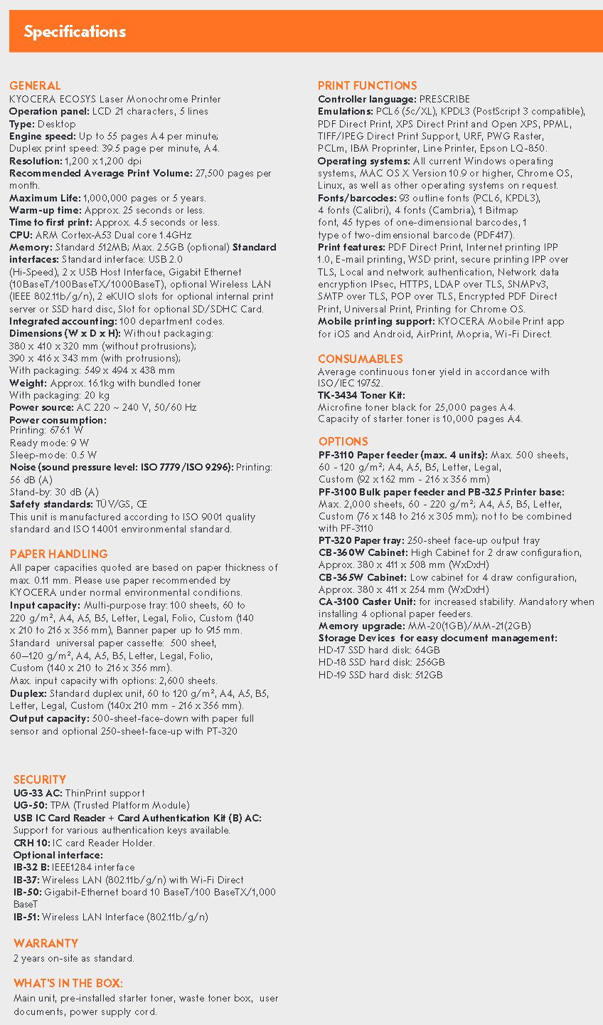 Kyocera ECOSYS PA5500X A4 Laser Monochrome Printer (55ppm), Automatic Duplex, LCD Display, USB and Ethernet, Optional Wireless/Wi-Fi Direct, 1200 DPI, 500 Sheet Cassette, Up to 100 sheet multipurpose feeder, Drum 500,000 pages, Average Print Volume: 27,500/mth, TK-3434 Toner Kit (25,000 Yield), 2 Years On-site Warranty