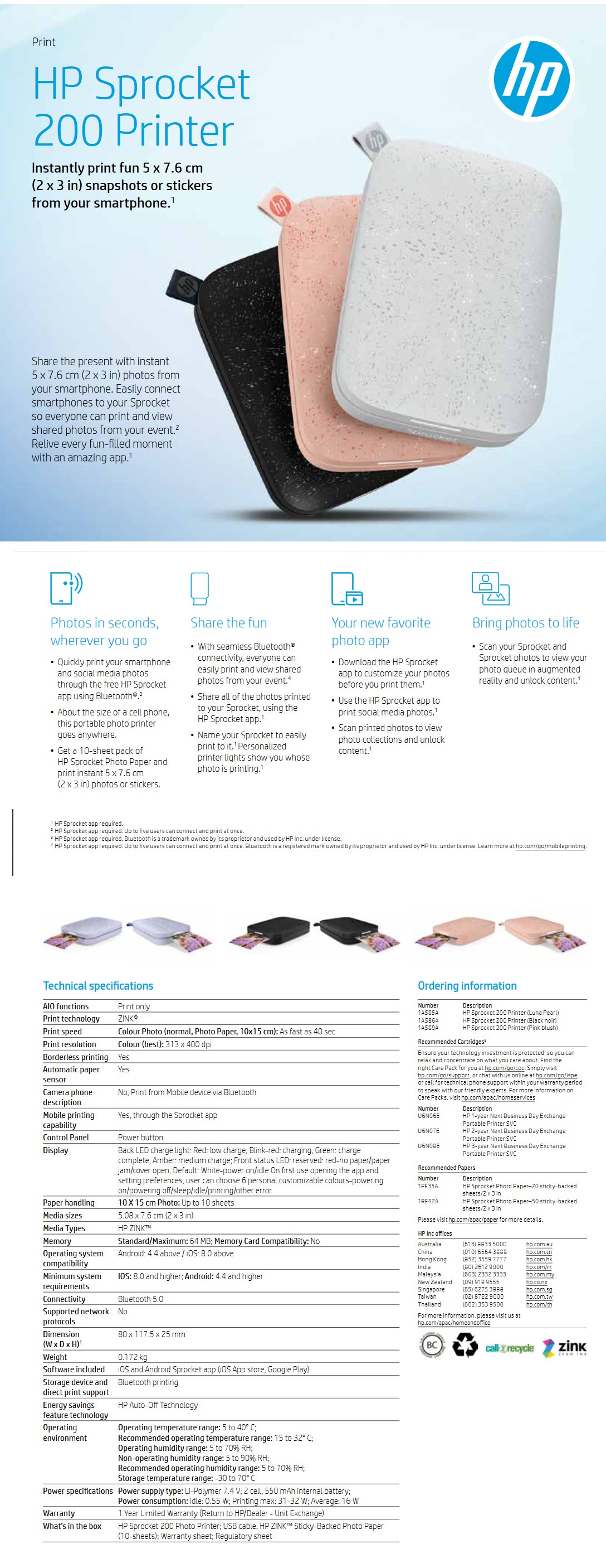- Paper Handling 10 X 15 cm Photo: Up to 10 sheets - Media sizes 5.08 x 7.6 cm (2 x 3 in) - Android: 4.4 above / iOS: 8.0 above - Dimension (W x D x H) 80 x 117.5 x 25 mm - Weight 0.172 kg - Software included iOS and Android Sprocket app (iOS App store, Google Play) - What�s in the box : HP Sprocket 200 Photo Printer; USB cable, HP ZINK� Sticky-Backed Photo Paper (10-sheets); Warranty sheet; Regulatory sheet - Warranty 1 Year