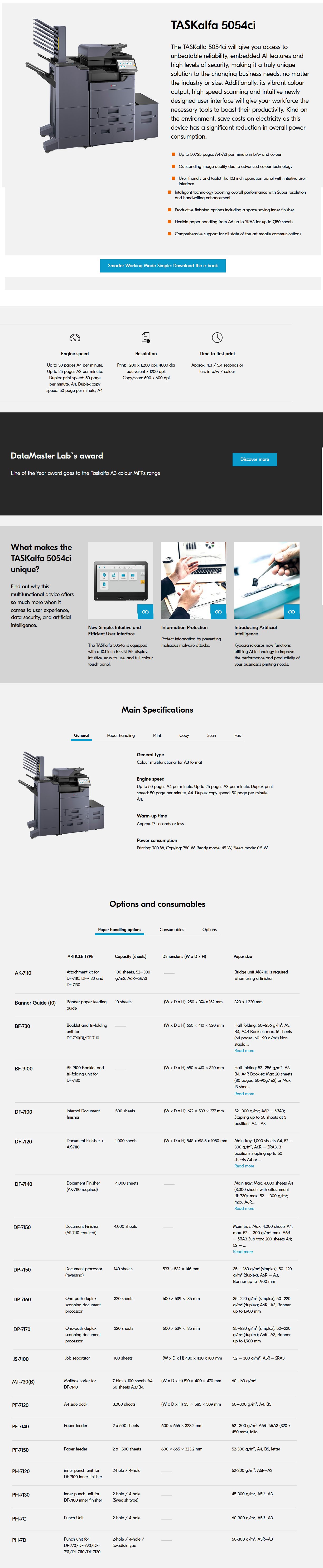 The TASKalfa 5054ci will give you access to unbeatable reliability, embedded AI features and high levels of security, making it a truly unique solution to the changing business needs, no matter the industry or size. Additionally, its vibrant colour output, high speed scanning and intuitive newly designed user interface will give your workforce the necessary tools to boast their productivity. Kind on the environment, save costs on electricity as this device has a significant reduction in overall power consumption.