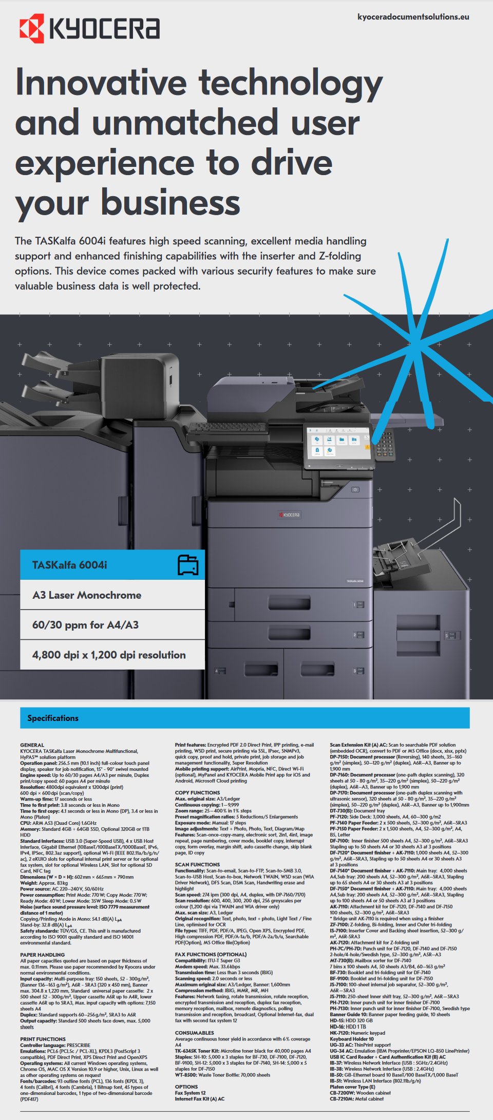 Up to 60/30 pages A4/A3 per minute in b/w User friendly and tablet like 10.1 inch operation panel with intuitive user interface High-level build in security features to protect organisation data Intelligent technology boosting overall performance with Super resolution and handwriting enhancement Comprehensive support for all state of-the-art mobile communications