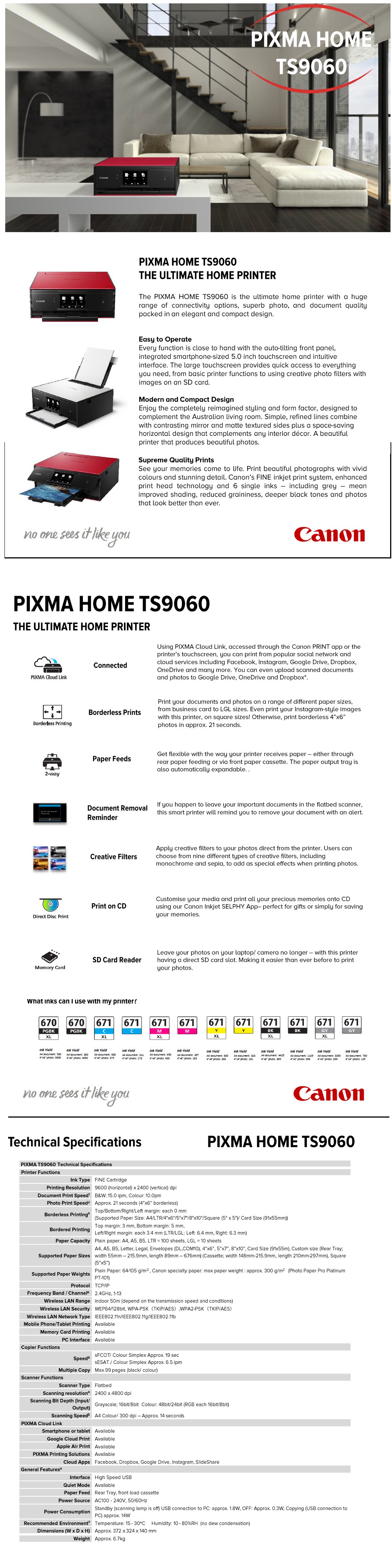 Canon TS9060 Pixma Home, Colour Multifunction Printer, Scan, Copy , Print, 5 inch Touchscreen, 6 ink tanks, Print on CD, SD Card Reader, Wireless, USB, 1 Year Warranty