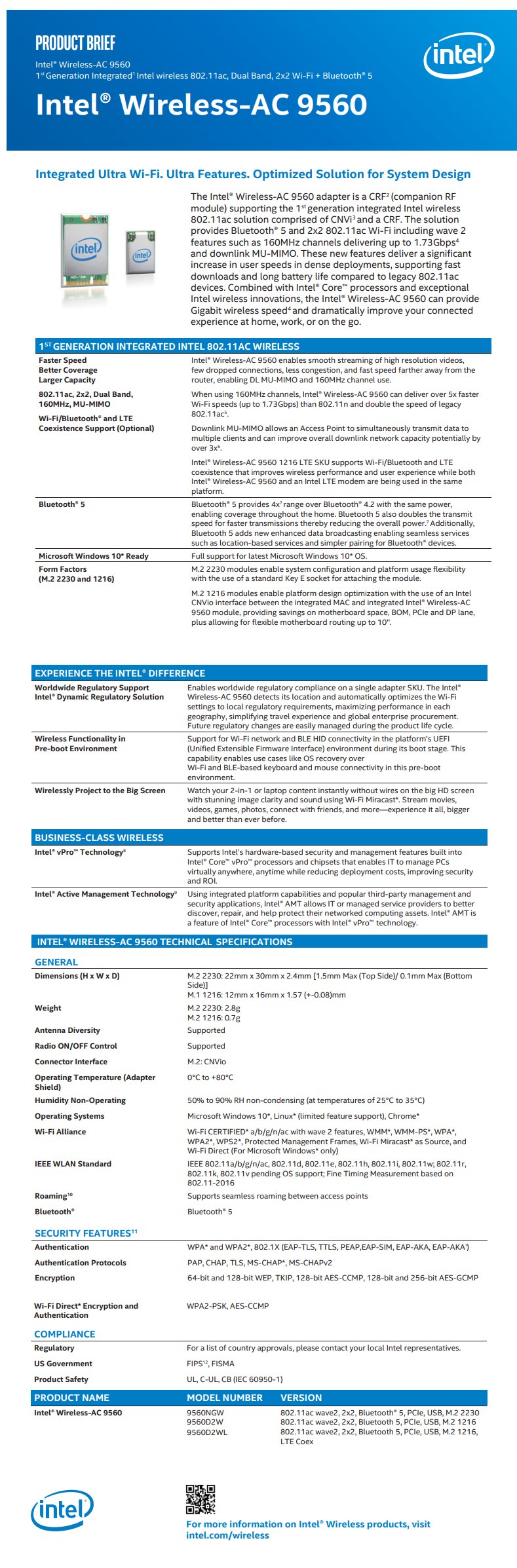 Intel Wireless-AC 9560, 2230, 2x2 AC+BT, Gigabit, vPro, PCIe Network Adapter