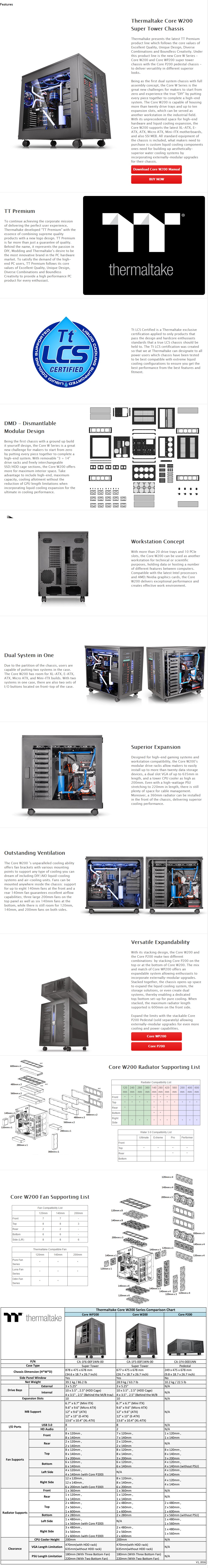 Thermaltake presents the latest TT Premium product line which follows the core values of Excellent Quality, Unique Design, Diverse Combinations and Boundless Creativity. Under this product line is the new Core W Series � Core W200 and Core WP200 super tower chassis with the Core P200 pedestal chassis � to deliver versatility in different superior looks.