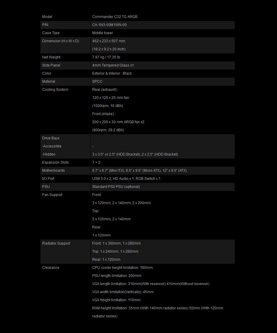 - 7 + 2 Expansion Slots - ATX Form Factor - 4mm Tempered Glass Side Panel - Fan Support: 3x 120 or 2x 140/200mm Front, 2x 120/140mm Top and 1x Rear Fan - I/O Ports: 2x USB 2.0, 1x HD Audio and 1x RGB Switch - Includes 2x 200mm ARGB Front Fans and 1x 120mm Rear Fan - Supports 2x 3.5 inch and 2x 2.5 inch Drive Bays - SPCC - CA-1N3-00M1WN-00 - 2 Years Limited Warranty