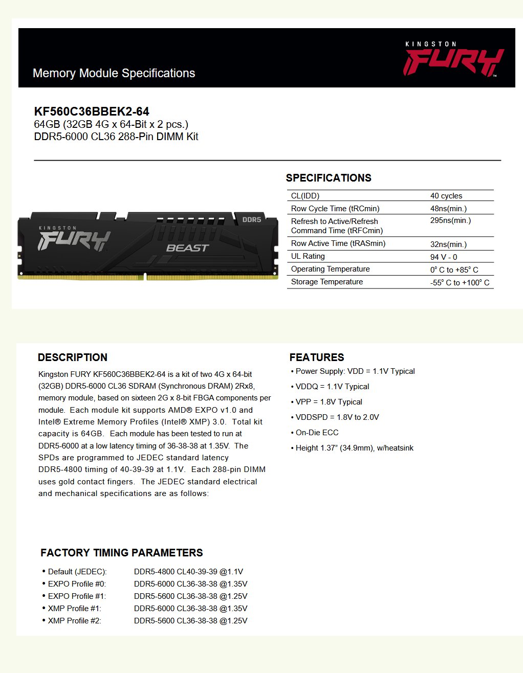 Each module has been tested to run at DDR5-6000 at a low latency timing of 36-38-38 at 1.35V. The SPDs are programmed to JEDEC standard latency DDR5-4800 timing of 40-39-39 at 1.1V. Each 288-pin DIMM uses gold contact fingers.