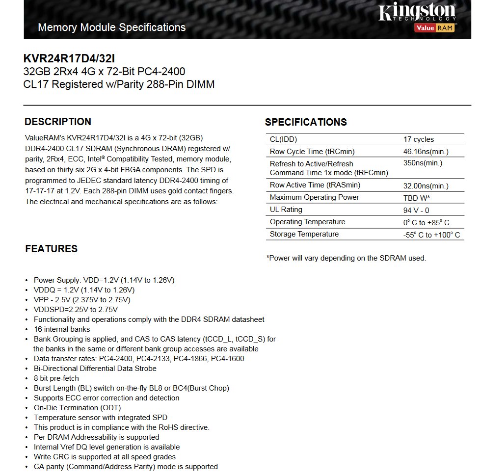 ValueRAM's KVR24R17D4/32I is a 4G x 72-bit (32GB) DDR4-2400 CL17 SDRAM (Synchronous DRAM) registered w/ parity, 2Rx4, ECC, Intel� Compatibility Tested, memory module, based on thirty six 2G x 4-bit FBGA components.